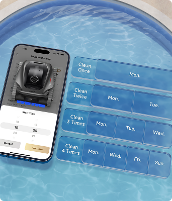 *The product appearance, structure, color, function and other details presented in the promotional materials are for illustration purposes only and may not be an exact representation of the product. Please refer to the actual product for accurate information. *6,000GPH: Tested under maximum power condition, based on our in-house lab. Actual performance may vary. *2″: Based on our in-house tests. Actual performance may vary. *240min, 4hrs, 3hrs: Tested under the specific cleaning modes, based on our in-house lab. Actual performance may vary. *1,900ft²: Refers to the maximum pool coverage under the floor cleaning mode based on our in-house tests. Actual performance may vary. *3μm: The 3μm rating indicates the mesh size of the filter. Based on our in-house tests. Actual performance may vary. This filter is sold separately via official channels. The ultra-fine filter is installed in the basket and is recommended for use with fine debris only. Please remove it for separate cleaning after each use and replace it regularly. *Week: A maximum of 4 cleanings can be scheduled per week. *The robot will stay in standby mode underwater and will automatically reactivate at preset times: When the battery is below 10%, the robot automatically docks. Ensure it is recharged and placed back into the water no later than 5 minutes before the next task starts to execute normally. If delayed beyond 5 minutes, the current cleaning task will not be performed. *3-second: The system will empty water from internal channels after retrieval. Actual performance may vary.