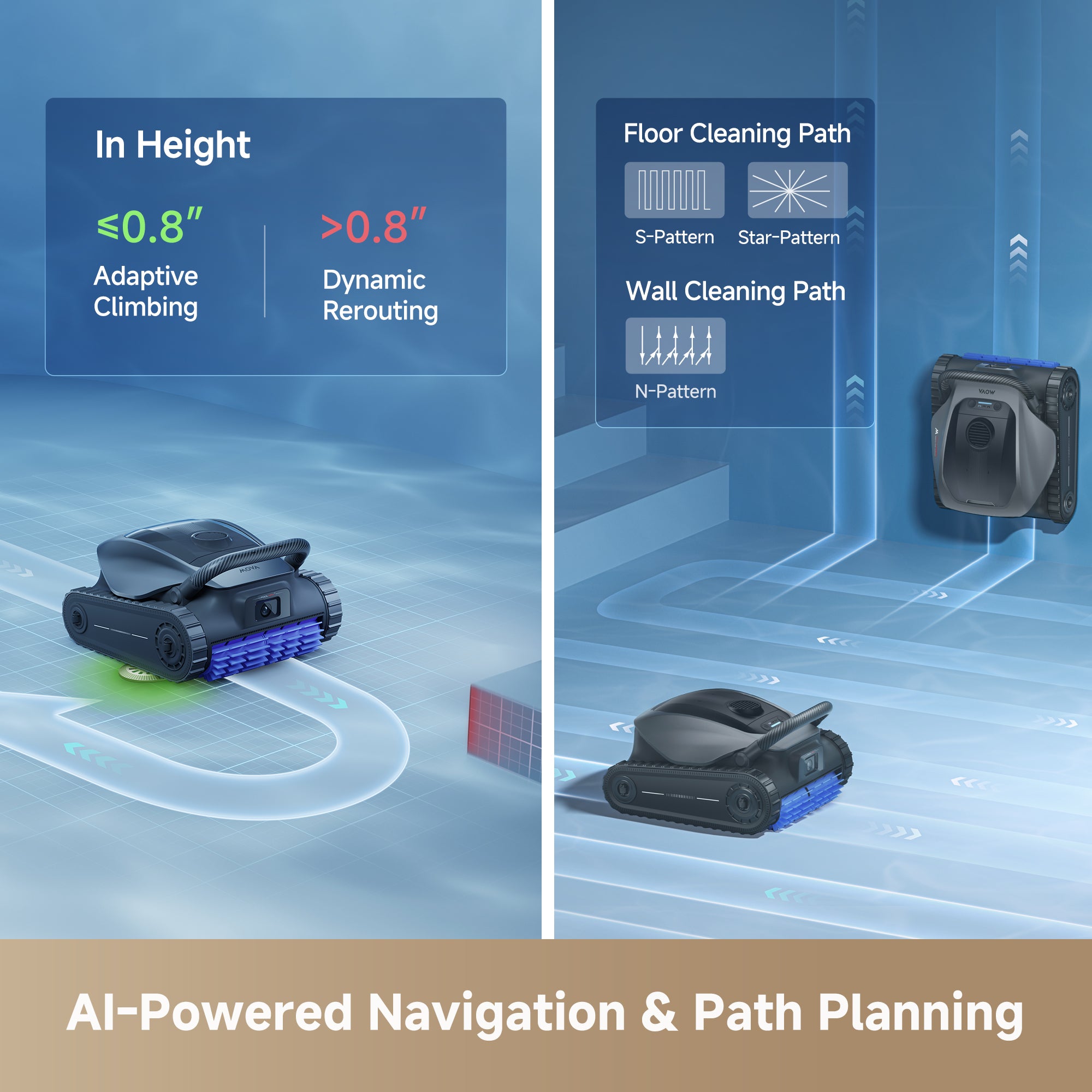 PoolSense 2.0, the intelligence behind PoolNavi™, integrates AI with six ultra-precise sensors to navigate pools with real-time accuracy. It seamlessly switches among three professional cleaning patterns—S, Star, and N—for complete pool coverage.