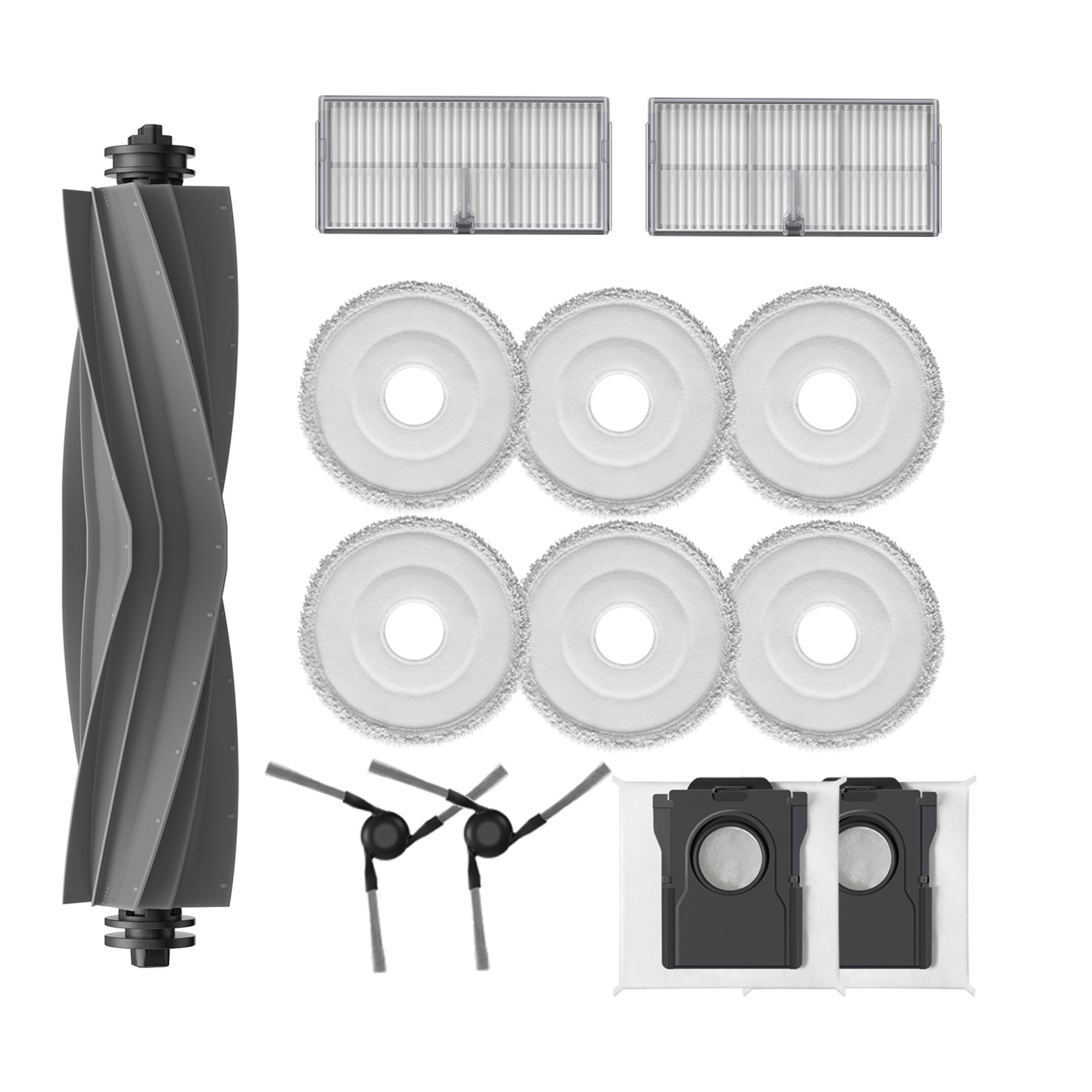 1Main Brush(Rubber)+2Side Brush+2Dust Box Filter+2Dust Colloection Bag+3 Pairs of Mop Cloth