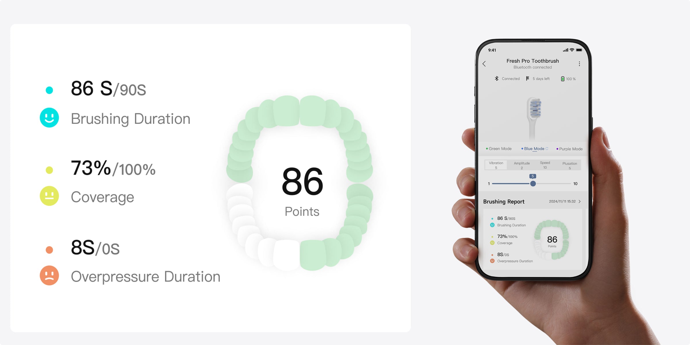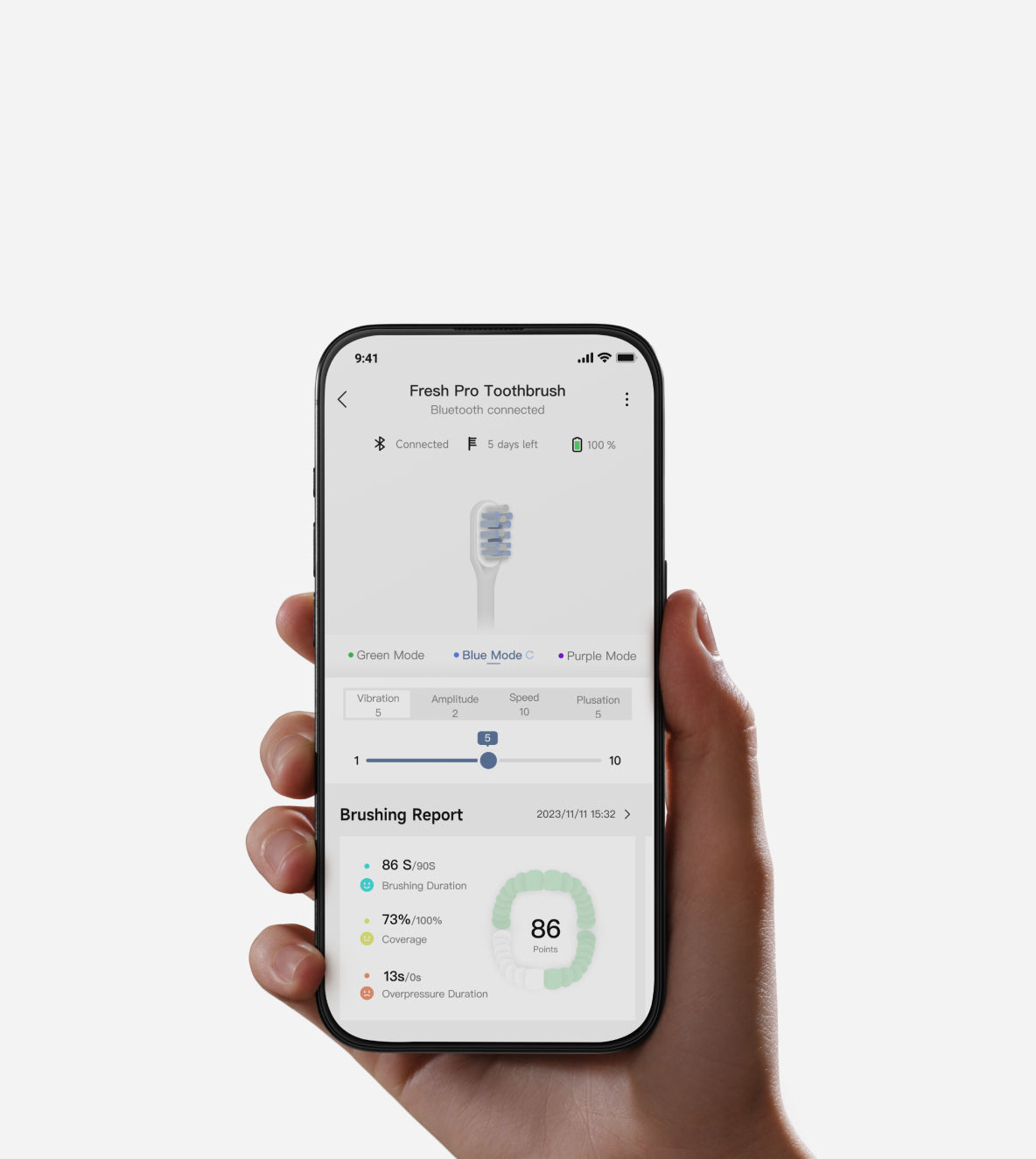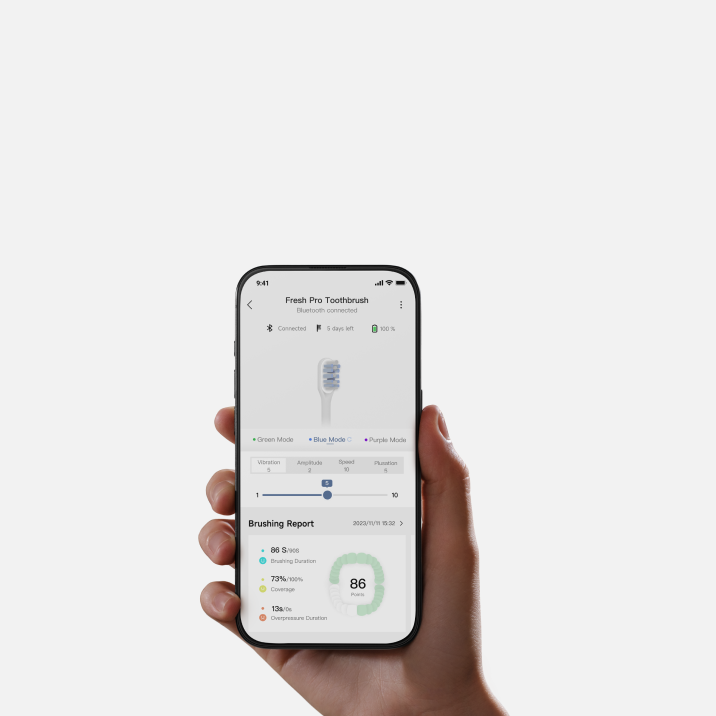 *30 days: Based on two minutes of brushing daily (Fresh Pro: one minute each in the morning and evening; Fresh: two minutes each in the morning and evening) in Standard Mode. Based on our in-house lab data. Actual performance may vary depending on usage.