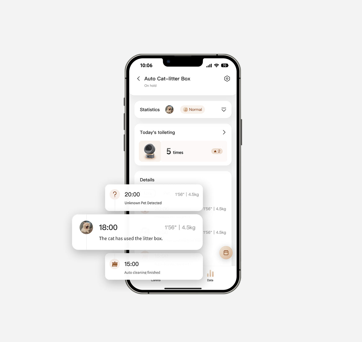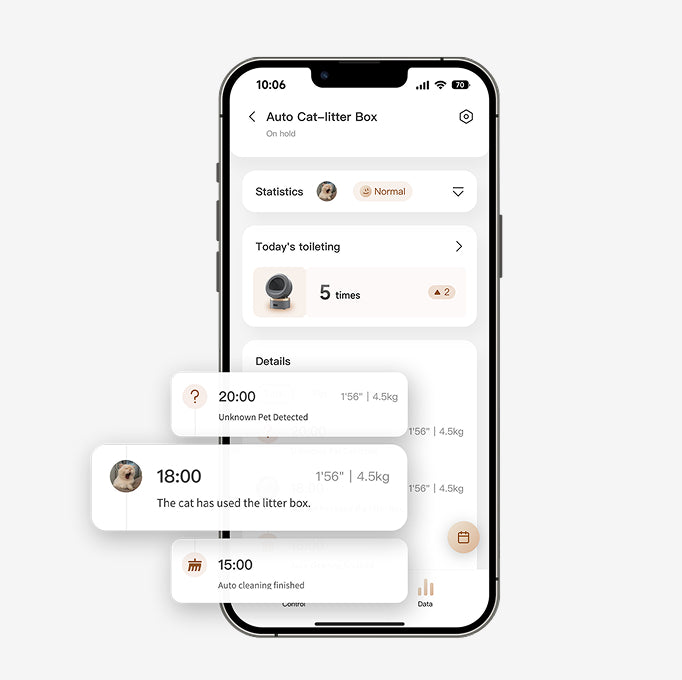 Supports multi-cat profile management through the weight sensor. Tracks each cat’s weight trends and toilet habits individually. Manage pets' data for a long time, detect abnormalities early to lower the risk of illness.
