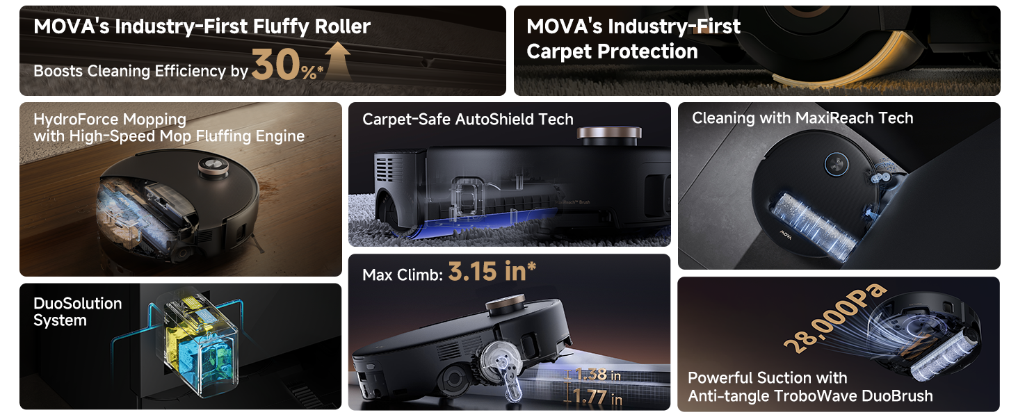 AutoShield™ Tech for Dry Carpets: Intelligently detects carpets to lift the mop and deploy a moisture shield, keeping rugs bone-dry while maintaining full suction and side brush rotation.
