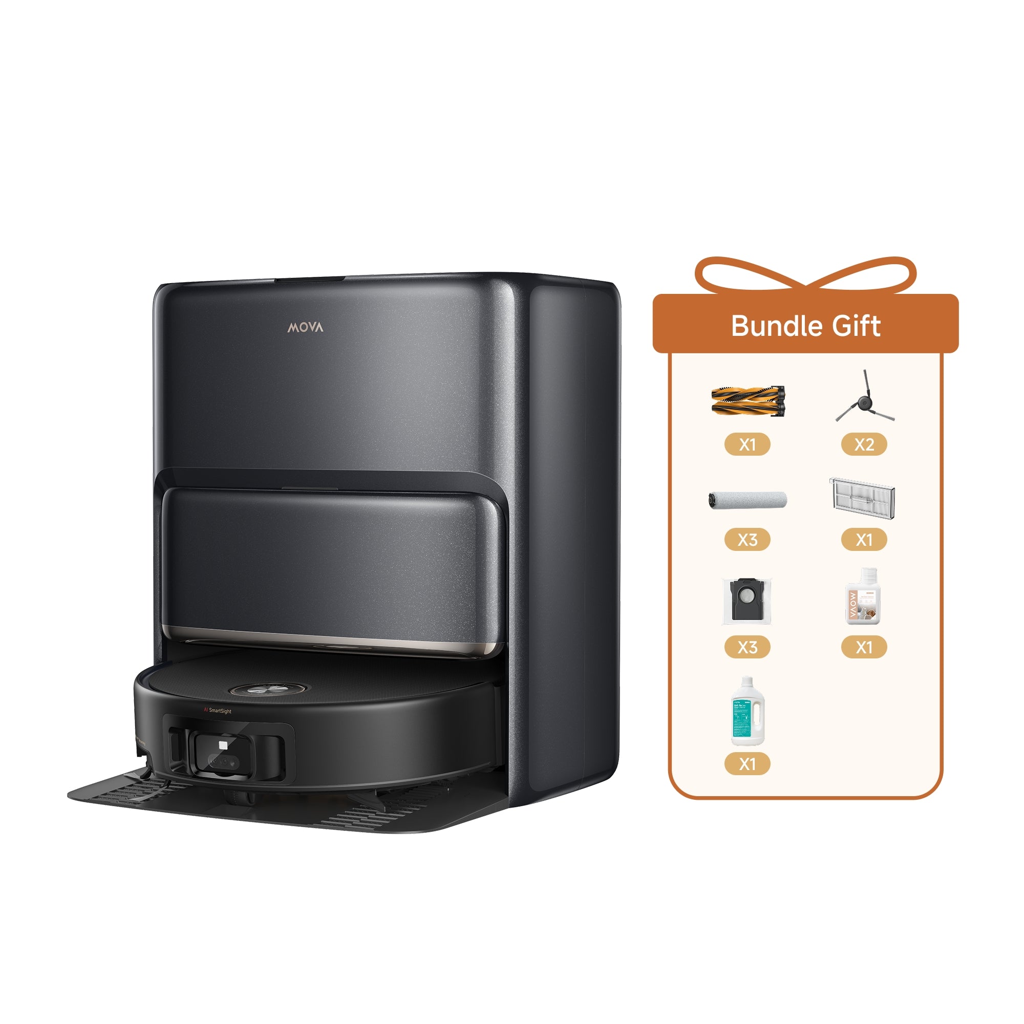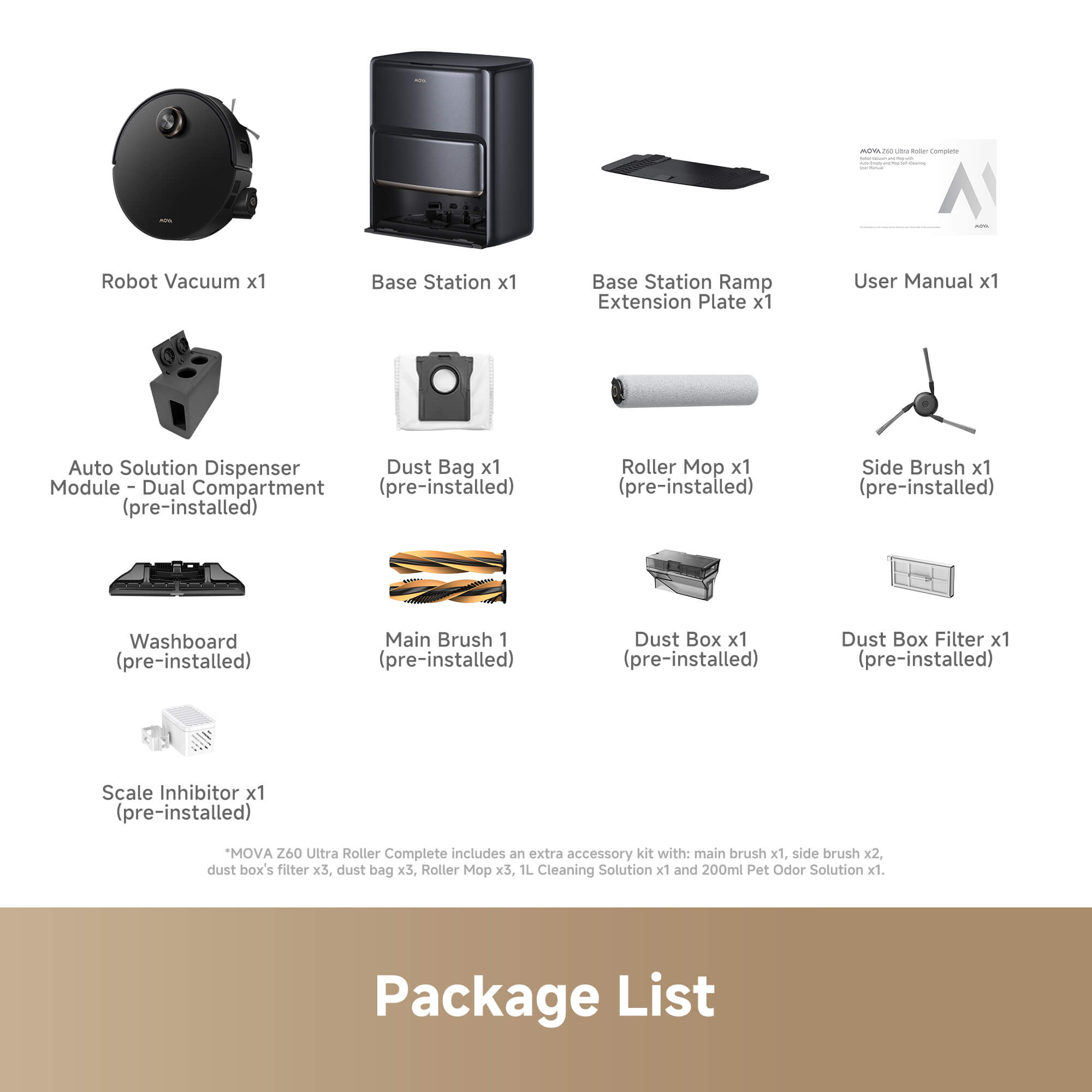 *MOVA Z60 Ultra Roller Complete includes an extra accessory kit with: Main Brush x1, Side Brush x2, Dust Box's Filter x3, Dust Bag x3, Roller Mop x3, 1L Cleaning Solution x1 and 200ml Pet Odor Solution x1.